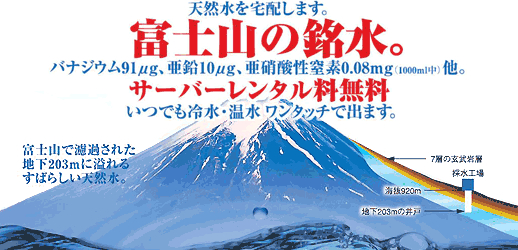 富士山のおいしい天然水を安全に「ご自宅でお気軽に」 水道水をろ過したミネラルウォーターはなく 富士山のふもとから毎日くみ上げるミネラルたっぷりの天然水 厳格な衛生基準をクリアした、安全なお水をどうぞ
